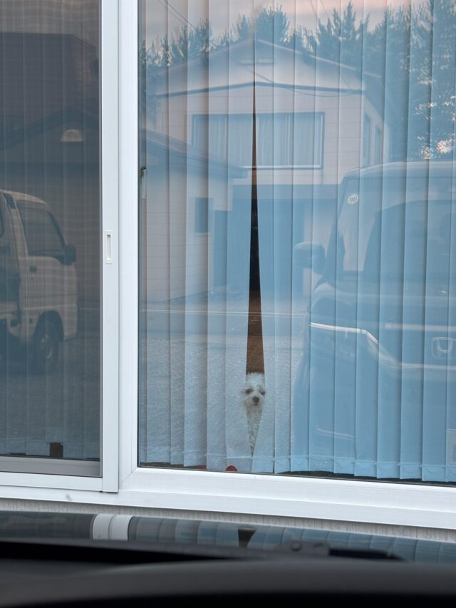 大きなテラス窓から覗いているシロ( ´∀` )