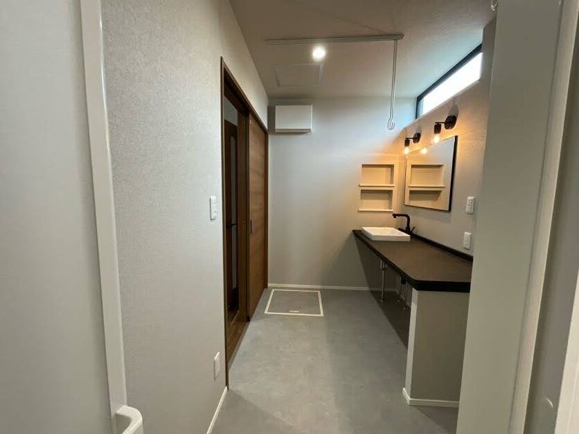 おしゃれ照明と洗面ニッチで上品な雰囲気に。室内物干し+造作棚で干す・畳むをスムーズにできます。 -