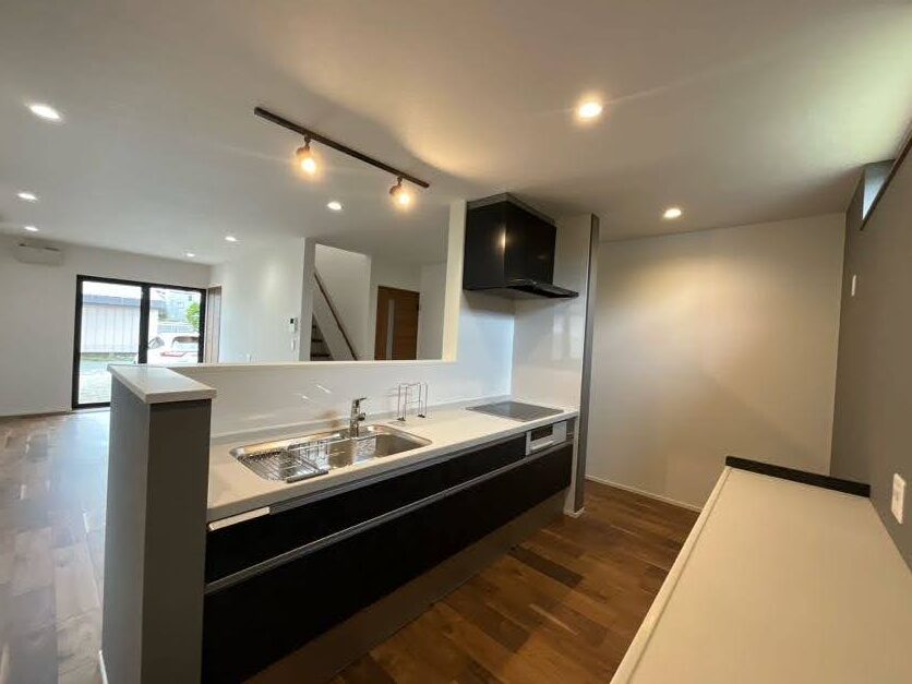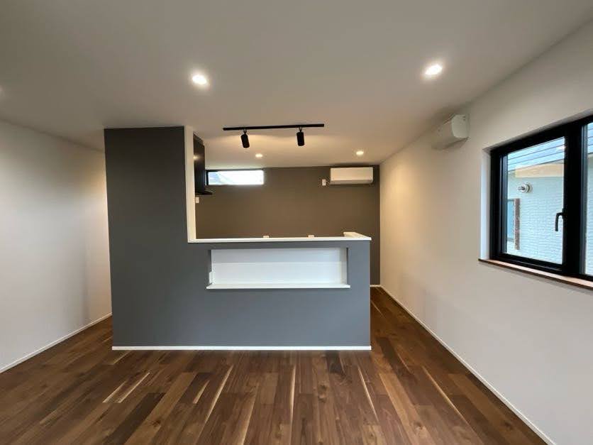 アイランドキッチンに壁をつけることにより、リビングのアクセントになります!また水撥ねや油汚れ防止と生活感の目隠しともなり、とても実用的です♪ -